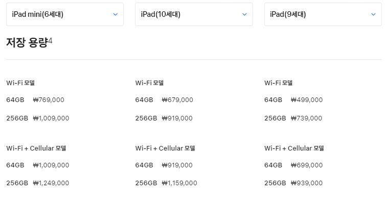모델이 여러 종류다 보니 구매의사가 있는 경우 어떤 모델을 사야하는지 많이 혼란스러워 집니다. 결론부터 아주 심플하게 정리해 드리자면 아이패드(기본모델)의 경우 초,중,고등 학생의 학습 용도에 적합한 수준의 모델입니다. 물론 상위 버젼으로 학습 하셔도 상관 없지만 학습과 간단한 작업 정도가 목적이라면 가격대비 딱 적합한 성능의 모델이라 할 수 있습니다.