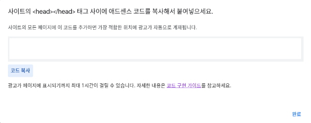 팝업 창으로 [애드센스 코드]가 뜹니다. [코드 복사] 버튼을 클릭해 코드를 복사합니다. 우측 하단의 [완료] 버튼을 클릭합니다.