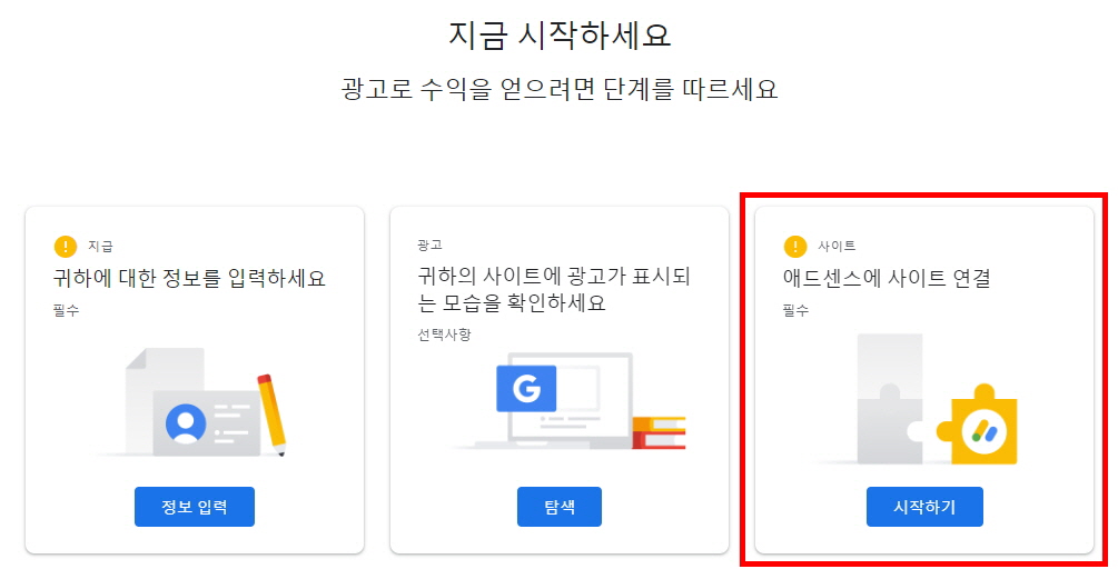 다시 구글 애드센스 사이트로 이동합니다. 홈 화면에서 우측 애드센스에 사이트 연결 박스의 [시작하기]를 클릭합니다.