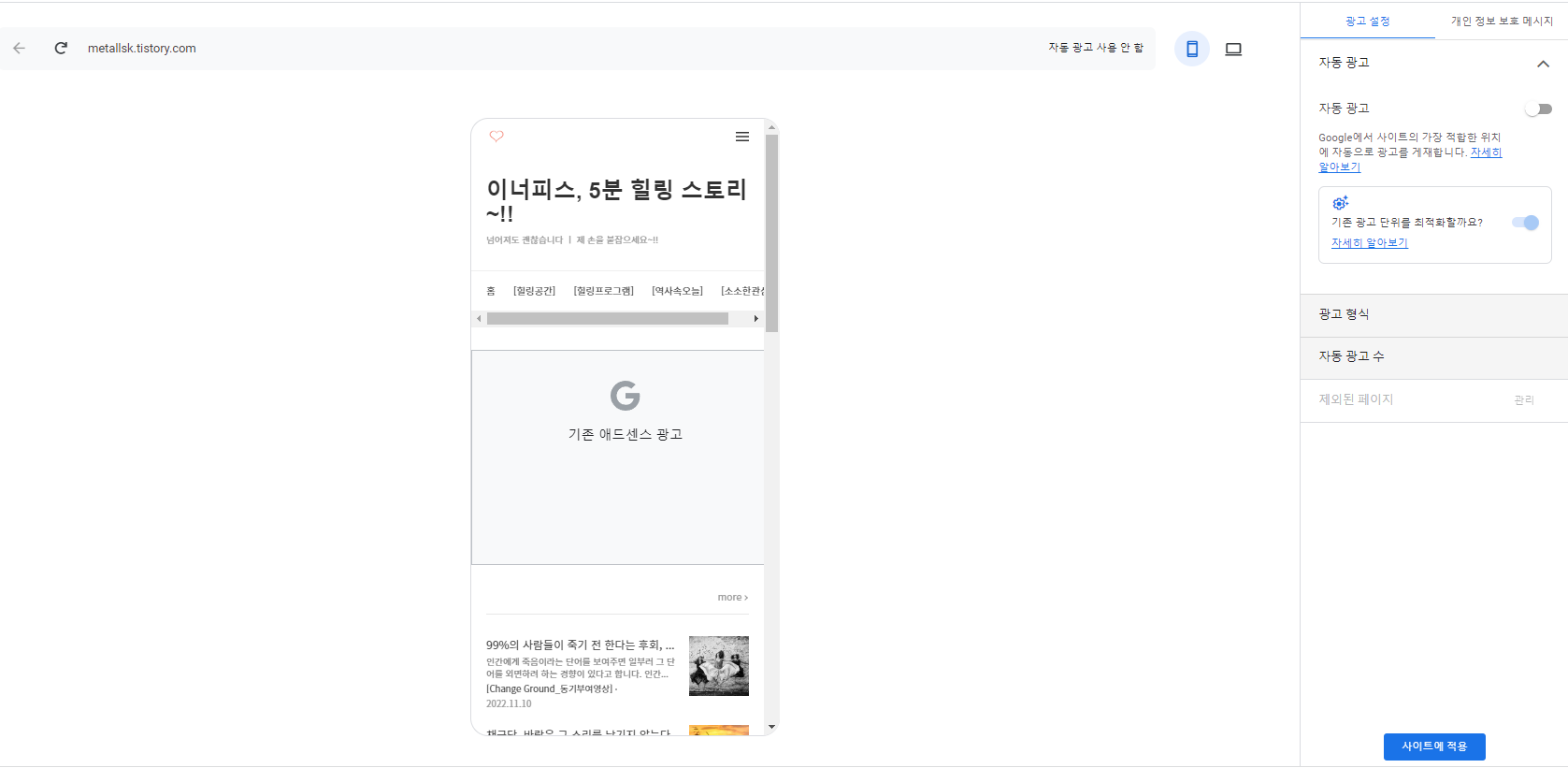 다시 광고 설정 미리보기 페이지가 나옵니다. 우측 상단의 [자동광고] 옆의 버튼을 오른쪽으로 활성화 시킵니다. 활성화 되면 버튼이 파란색으로 변합니다. 우측 하단의 [사이트에 적용]을 클릭해 줍니다.