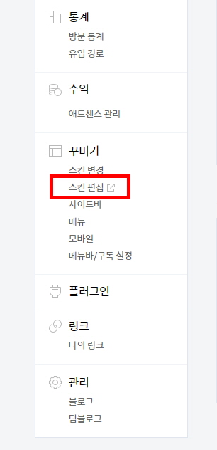 이젠 티스토리의 블로그 관리 화면을 클릭합니다. 블로그 관리 화면 좌측 사이드바에 위치한 [꾸미기] - [스킨 편집]을 클릭합니다.