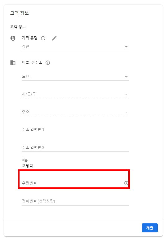 위 이미지는 결제 프로필 ID가 이미 있는 경우입니다. 이럴 때는 별도 작성하지 않고 넘어가셔도 됩니다. 대신 이름, 주소, 우편번호는 정확하게 입력해 주어야 합니다. 모두 작성했으면 [제출] 버튼을 클릭 합니다.
