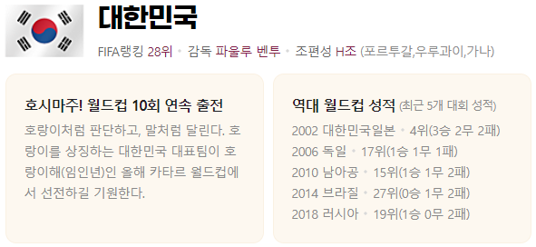 | [2022.11.25.] 카타르 월드컵 조별 경기결과 및 하이라이트 영상!! (8) | 2022.11.25 |