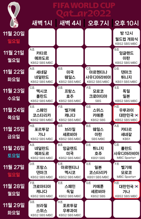 2022 카타르 월드컵 대한민국 경기일정/ 조편성/ 조별 경기일정/ 개막전/ 중계방송 안내