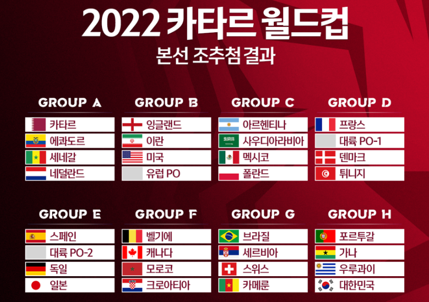 이번 카타르 월드컵에서 죽음의 조는 독일, 스페인이 속한 E조로 이웃나라 일본도 함께 속해 있습니다. E조를 제외하면 전반적으로 전력이 고르게 분배가 되어 어느 한 조도 쉬운 조는 없어 보입니다. 대한민국의 경우 첫 두 경기인 우루과이, 가나 전에서 최상의 결과를 얻고 마지막 포르투갈과 상대하는 전략으로 부담을 줄여야 할 것으로 보입니다.