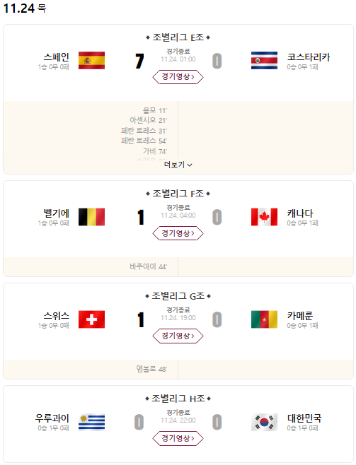 | [2022.11.24.] 카타르 월드컵 조별 경기결과 및 하이라이트 영상!! (12) | 2022.11.24 |