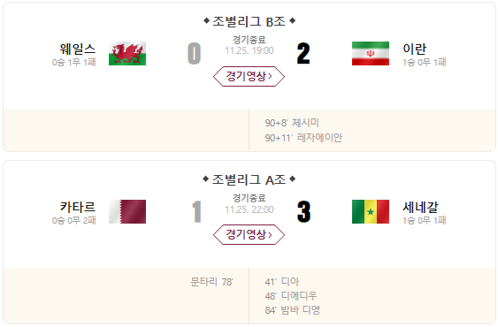 [~ 25일] 2022 카타르 월드컵 조별 경기결과 & 하이라이트 영상 모음