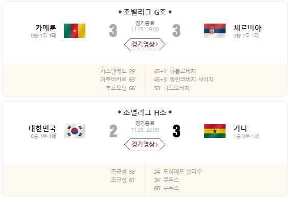 [~ 28일] 카타르 월드컵 조별 경기결과 & 하이라이트 영상 모음