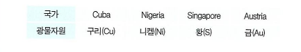 국가명을 영어로 적어 보면 Cuba, Nigeria, Singapore, Austria입니다. 보유한 광물자원은 국가명 영어 철자 어두에