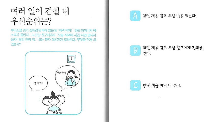추리소설 읽기 삼매경에 빠져 있는데 "저녁 먹자!" 하는 어머니의 목소리가 들린다. 그 순간 친구에게서 "오늘 저녁에 시간 나면 만나서 놀자! 빨리 연락 줘."하는 문자 메세지가 도착한다. 무엇을 먼저 하겠는가?