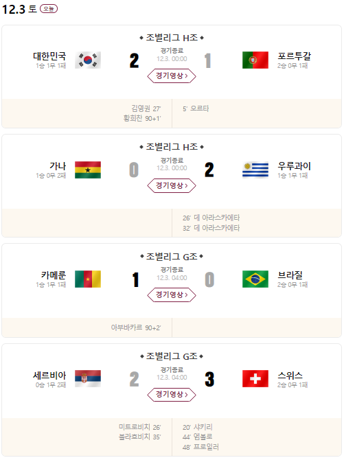 [2022.12.3.] 카타르 월드컵 조별 경기결과 및 하이라이트 영상!!