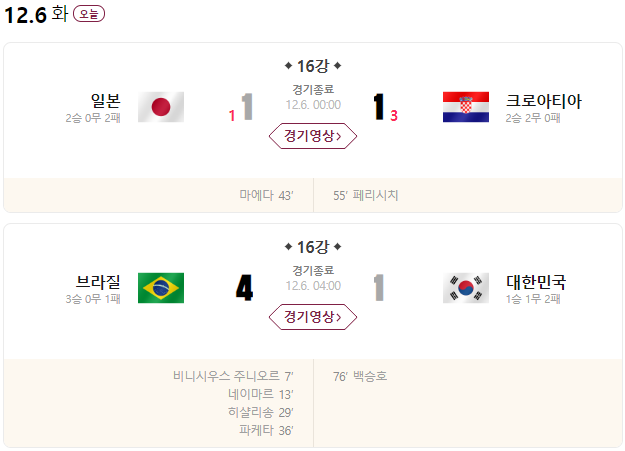 [2022.12.6.]카타르 월드컵 16강 토너먼트 경기 결과 및 하이라이트 영상!!
