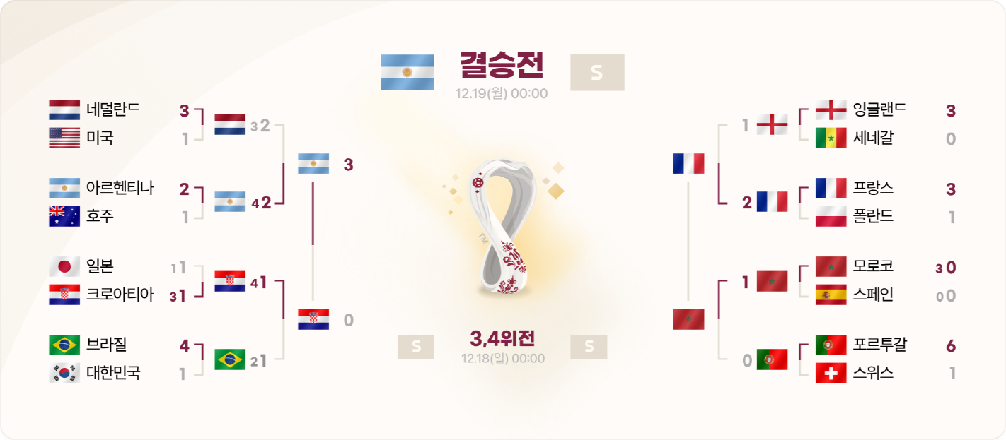 ~12/11일까지 8강 토너먼트 경기가 마무리 되었으며 4강 진출 국가가 모두 확정되었습니다. 4강 진출 국가는 아르헨티나, 크로아티아, 프랑스, 모로코입니다!! 이제부터는 4강 토너먼트 경기의 결과를 모두 모아서 하이라이트 영상과 함께 매일 제공해 드리겠습니다.