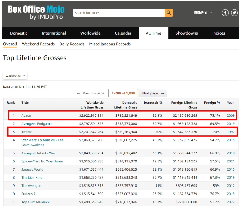 제임스 카메룬 감독이 제작한 <아바타2 물의길>은 무려 2조 6514억원이 영화의 손익분기점이라고 알려져 있습니다. 타이타닉 또한 제임스 카메룬 감독의 작품이죠. 물을 소재로 한 작품에 큰 성과를 보이는 감독이기도 한 흥행의 귀재입니다.