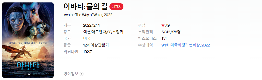 <아바타2 물의길> 감독 출연진 평점 리뷰 관객수 정보는 아래내용 및 링크를 통해 실시간으로 업데이트 내용을 확인 가능합니다.