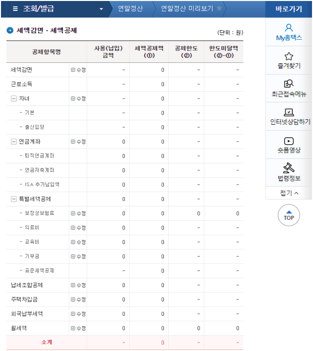 ▶해당 화면은 홈택스 '연말정산 미리보기 - 세액감면.세액공제' 부분입니다.