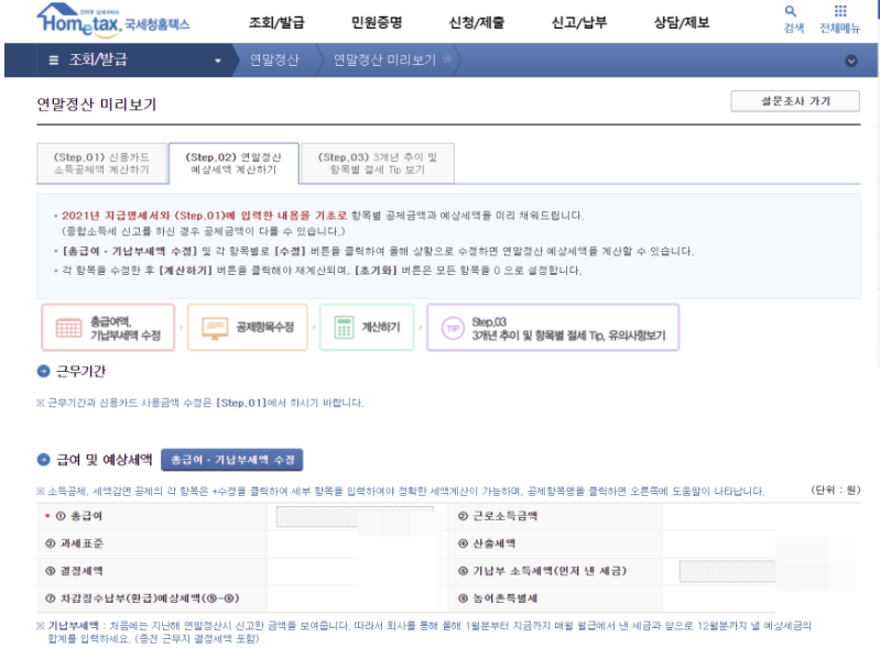 국세청 홈텍스 홈페이지에서 제공하는 연말정산 환급금 조회 범위는 올해 2022.1월~2022.9월까지 카드 사용 내역이 자동 등록되어 있다. 따라서 10~12월까지 내역은 예상 금액을 입력 후 환급 세액을 확인해 볼 수 있다.