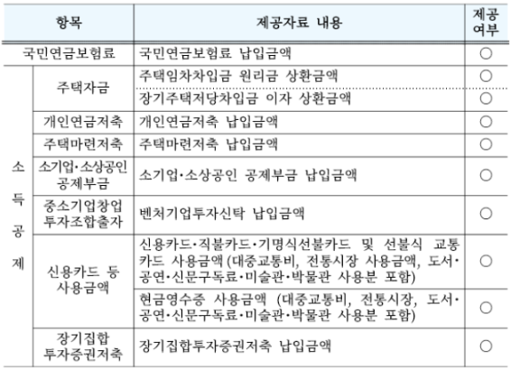 소득공제 항목에는 국민연금 보험료, 공무원연금 납입액, 건강보험료, 주택자금, 개인연금저축, 소기업 소상공인 공제부금, 주택 마련 저축, 신용카드 사용액, 장기집합 투자증권저축 등이 있습니다. 아래는 국세청 연말정산 간소화 서비스에서 체크할 수 있는 소득공제 항목들 입니다.