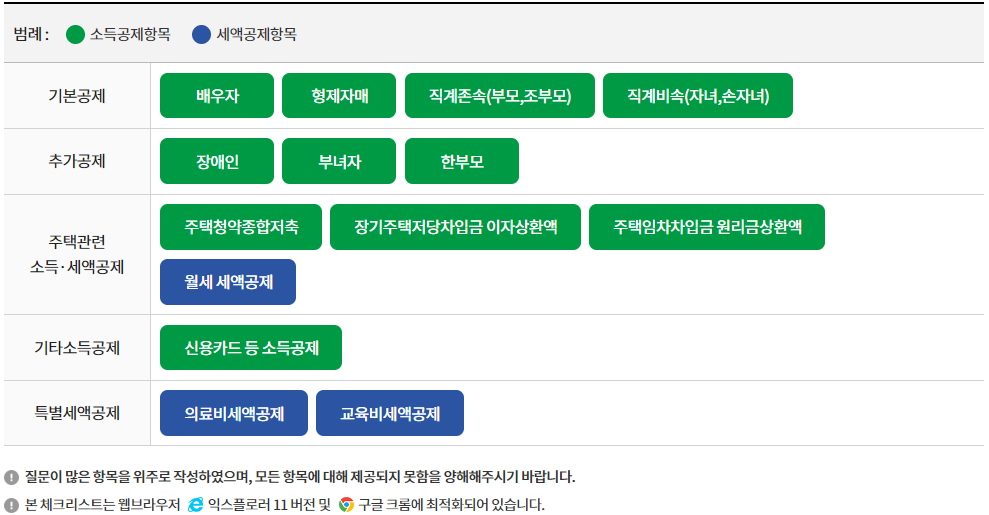 아래 연말정산 Self-체크리스트는 질문이 많은 항목 위주로 표시되어 있으며, 모든 항목에 대해 제공되지는 않았습니다. 아래 이미지 클릭 후 원하시는 항목을 선택하시면 직접 공제여부를 판단 하실 수 있습니다.
