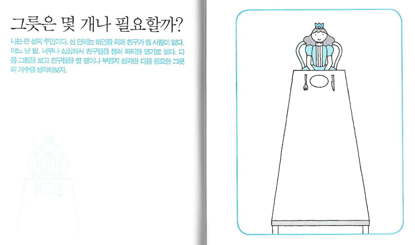 나는 큰 성의 주인이다. 성 안에는 하인들 외에 친구가 될 사람이 없다. 어느 날 밤, 너무나 심심해서 친구들을 불러 파티를 열기로 했다. 다음 그림을 보고 친구들을 몇 명이나 부를지 생각한 다음 필요한 그릇의 개수를 생각해보자.