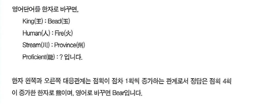 영어 단어를 한자로 바꾸면, King(王): Bead(玉), Human(人): Fire(火), Steam(川): Province(州), Proficient(熊): ? 입니다. 한자 왼쪽과 오른쪽 대응관계는 점획이 점차 1획씩 증가하는 관계로서 정답은 점획 4획이 증가한 한자로 (熊)이며, 영어로 바꾸면 Bear입니다.