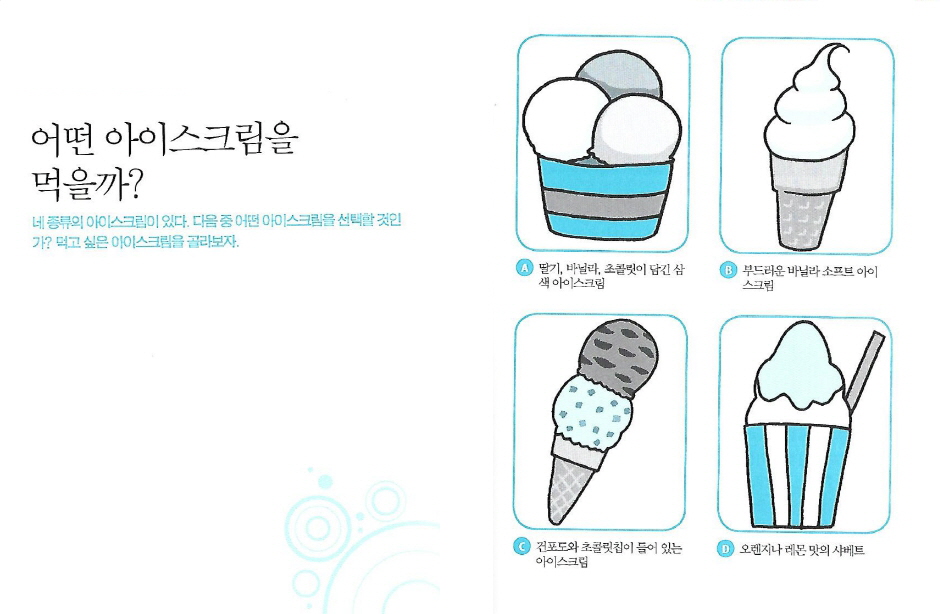 네 종류의 아이스크림이 있다. 다음 중 어떤 아이스크림을 선택할 것인가? 먹고 싶은 아이스크림을 골라보자.