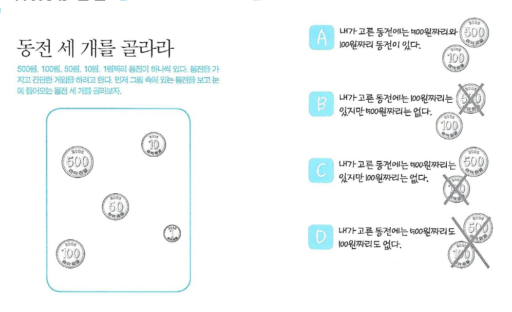 500원, 100원, 50원, 10원, 1원짜리 동전이 하나씩 있다. 동전을 가지고 간단한 게임을 하려고 한다. 먼저 그림 속에 있는 동전을 보고 눈에 들어오는 동전 세 개를 골라보자.