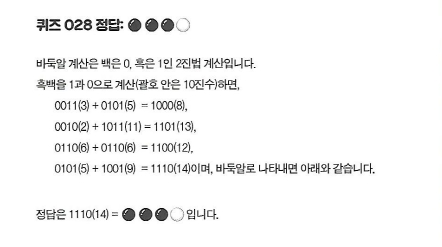바둑알 계산은 백은 O, 흑은 1인 2진법 계산입니다. 흑백을 1과 0으로 계산(괄호 안은 10진수)하면 아래와 같습니다.