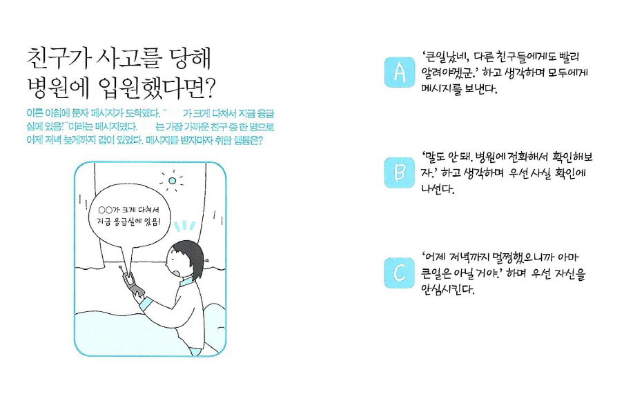 이른 아침에 문자 메세지가 도착했다. "OO가 크게 다쳐서 지금 응급실에 있음!"이라는 메세지였다. OO는 가장 가까운 친구 중 한 명으로 어제 저녁 늦게까지 같이 있었다. 메세지를 받자마자 취할 행동은?