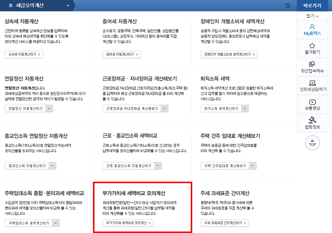 부가세를 더하여 총 결제금액을 알고 싶다면, 다음과 같이 계산합니다. [총 결제 금액 = 봉사료 + 부가세] 예를 들어, 한국에서 봉사료가 10,000원이라면, 부가세는 1,000원(=10,000원 × 0.1)이며, 총 결제금액은 11,000원입니다. 직접 계산하는 것보다 편리한 부가세 계산기 사용을 원하는 경우, 아래의 홈택스에서 제공하는 '부가세 세액비교 모의계산'을 사용하시면 되겠습니다.