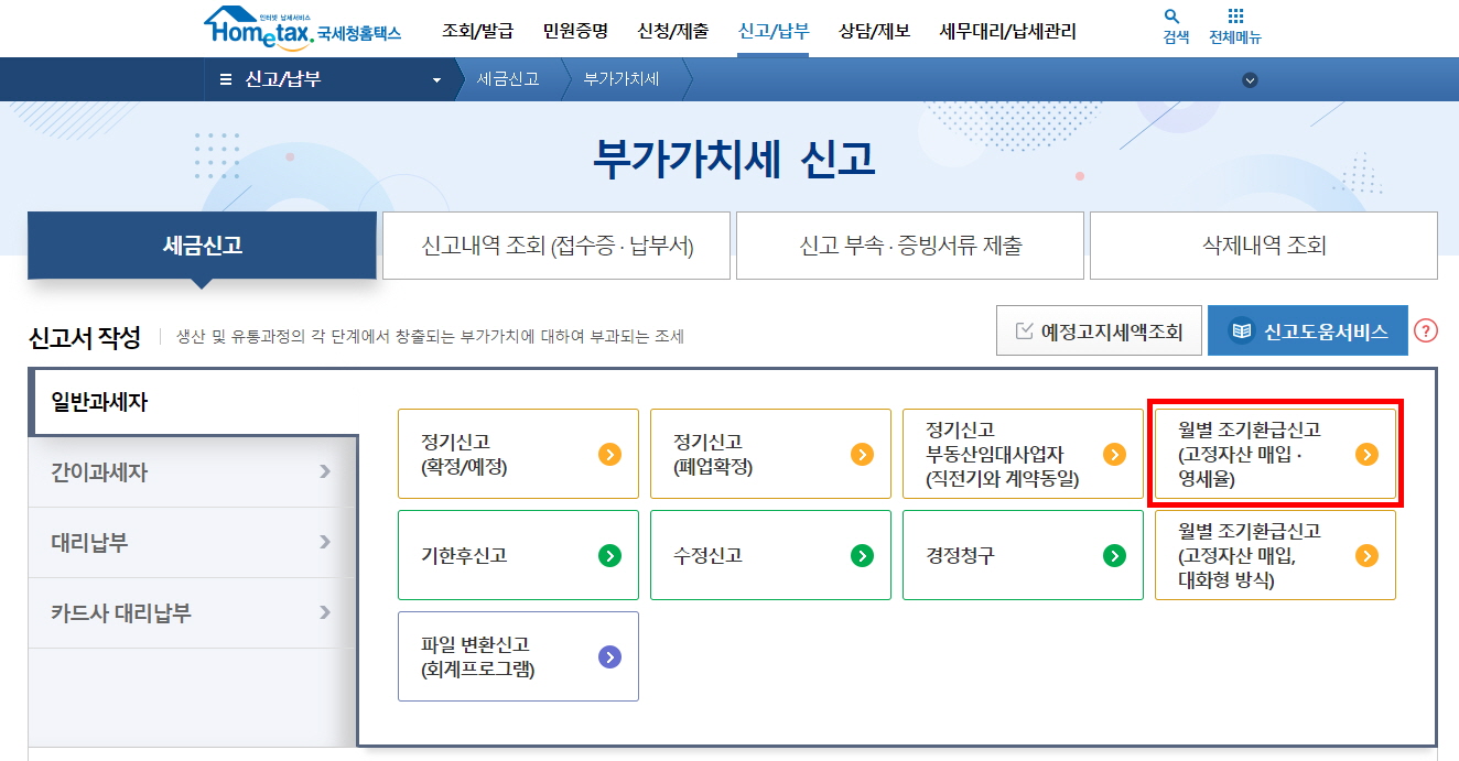 - 홈택스>신고/납부>부가가치세>조기환급신고(월별)