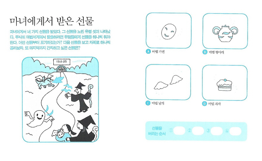 마녀에게서 네 가지 선물을 받았다. 그 선물을 노린 유령 셋이 나타났다. 무사히 마법세계에서 탈출하려면 유령들에게 선물을 하나씩 줘야한다. 어떤 선물부터 포기하겠는가? 다음 선물을 보고 차례로 하나씩 골라보자. 또 마지막까지 간직하고 싶은 선물은?